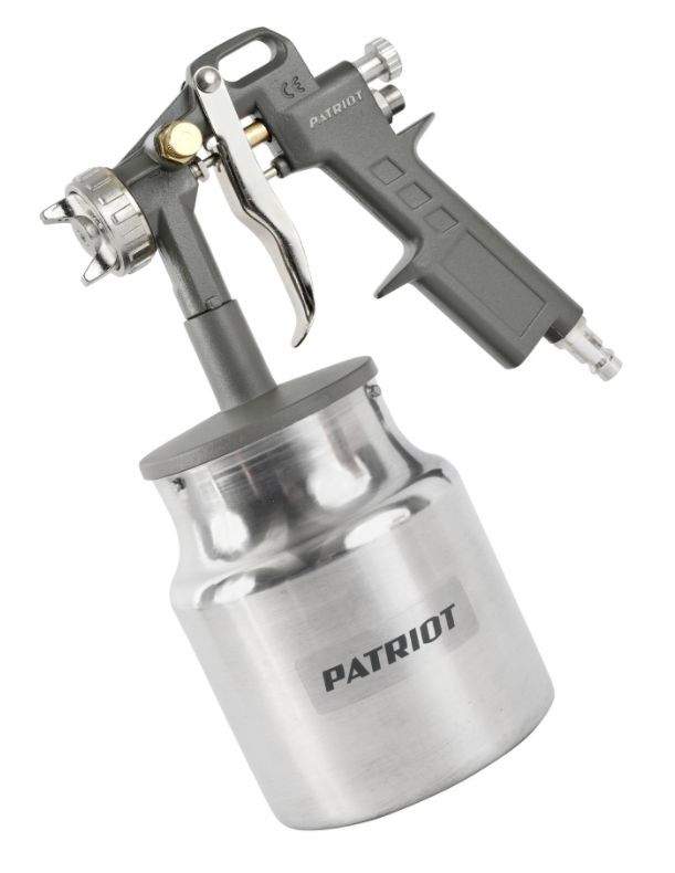 Пневмокраскораспылитель PATRIOT LV 162В, Расход воздуха: 400 л/мин; Объем бачка для краски: 1 л. нижний; Давление: 3.0-4.0 бар; Диаметр сопла: 1,5 мм; Ширина факела: 120-220 мм; Соединение: быстросъем.