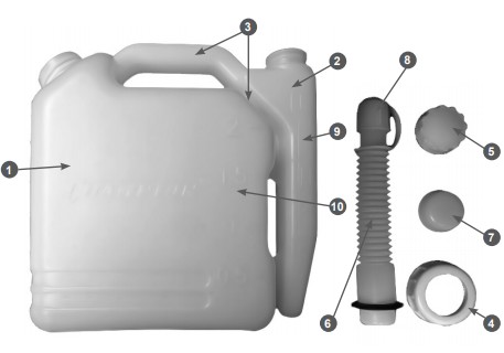 Материал пластик Комбинированная Для топливной смеси Вертикальная Для горюче-смазочных материалов 2 л Сливное устройство в комплекте Емкость для приготовления топливной смеси, 1 – емкость, 2 – масляный резервуар, 3 – соединительные полости, 4 – крышка топливного резервуара, 5 – крышка масляного резервуара, 6 – наливная трубка, 7 – заглушка, 8 – крышка наливной трубки, 9 – шкала масляного резервуара, 10 – шкала емкости.