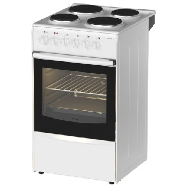 (ШхГхВ) 50x56x85 см,электрическая плита эмалированная рабочая поверхность,электрическая духовка 50 л.Количество режимов работы духовки 4.,механическое управление.Тип нагревательного элемента чугунные конфорки (4шт.)Хозяйственный отсек.Регулируемые опоры.