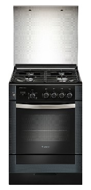 Кухонная плита оборудована четырьмя конфорками разной мощности и вместительной духовкой на 52 литра. Широкий варочный стол 60х60 см выполнен из нержавеющей стали, покрытой фирменной жаростойкой эмалью. В данной модели используются двухмодульные чугунные решетки высокой прочности с резиновыми защитными накладками. Стеклянный черный фасад с декоративной серой окантовкой хорошо гармонирует с хромированной отделкой элементов управления и ручкой духового шкафа.