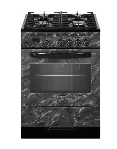 Газовая плита. Цвет: черный с рисунком "мрамор". Варочная поверхность: стеклянная. Габаритные размеры ШхГхВ: 60х60х85 см. Полезный объём духовки: 52 л. Фасад стеклянный. Варочная поверхность стеклянная. Без крышки. Вертел с электроприводом. Выдвижной ящик для посуды и принадлежностей. Газ-контроль горелок стола. Газ-контроль духовки. Гриль. Ножки регулировочные. Подсветка духовки двойная. Съемные проволочные направляющие духовки. Таймер сенсорный. Терморегулятор (термостат). Чугунные решетки горелок стола. Электророзжиг горелок, встроенный в ручки. Электророзжиг духовки, встроенный в ручку.