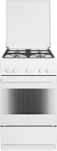 Габариты ШхГхВ, см: 50х58.5х85; Объем духового шкафа, л: 52; Тип очистки: Гидролизная; Цвет: Белый; Материал варочной поверхности: Эмаль; Материал решеток варочной поверхности: Чугун; Крышка плиты: Металлическая; Электророзжиг горелок стола: Кнопка розжига на панели; Тип направляющих духового шкафа: Съемные проволочные; Внутреннее покрытие духового шкафа: Эмаль легкой очистки SMART CERAMIC; Количество стекол в дверце духового шкафа: 2; Ящик для посуды и принадлежностей: Откидная крышка; Внутреннее освещение духового шкафа; Контроль температуры духового шкафа: Кран с безопасностью; Нижний нагрев; Жаровня: 1; Регулировочные ножки; Комплект сменных сопел; Противень: 1; Решетка варочной поверхности: 1; Решетка духового шкафа: 1; Диапазон номинального напряжения сети, В: 220-230; Номинальная частота сети, Гц: 50; Основная горелка духового шкафа, Вт: 2350