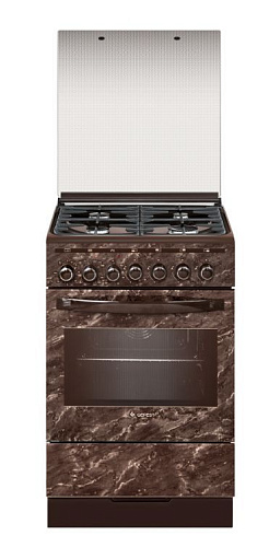 Габаритные размеры ШхГхВ: 50х58.5х85 см * Цвет: коричневый с рисунком "мрамор". Варочная поверхность: эмалированная * Объём духовки: 55 л. Духовка: электрическая * Вертел с электроприводом * Съемные проволочные направляющие духовки * Выдвижной ящик для посуды и принадлежностей * Таймер электромеханический * Газ-контроль горелок стола * Терморегулятор (термостат) * Гриль электрическийУсиленный гриль с конвекцией * Ножки регулировочные * Чугунные решетки горелок стола * Подсветка духовки одинарная * Электророзжиг горелок, встроенный в ручки *