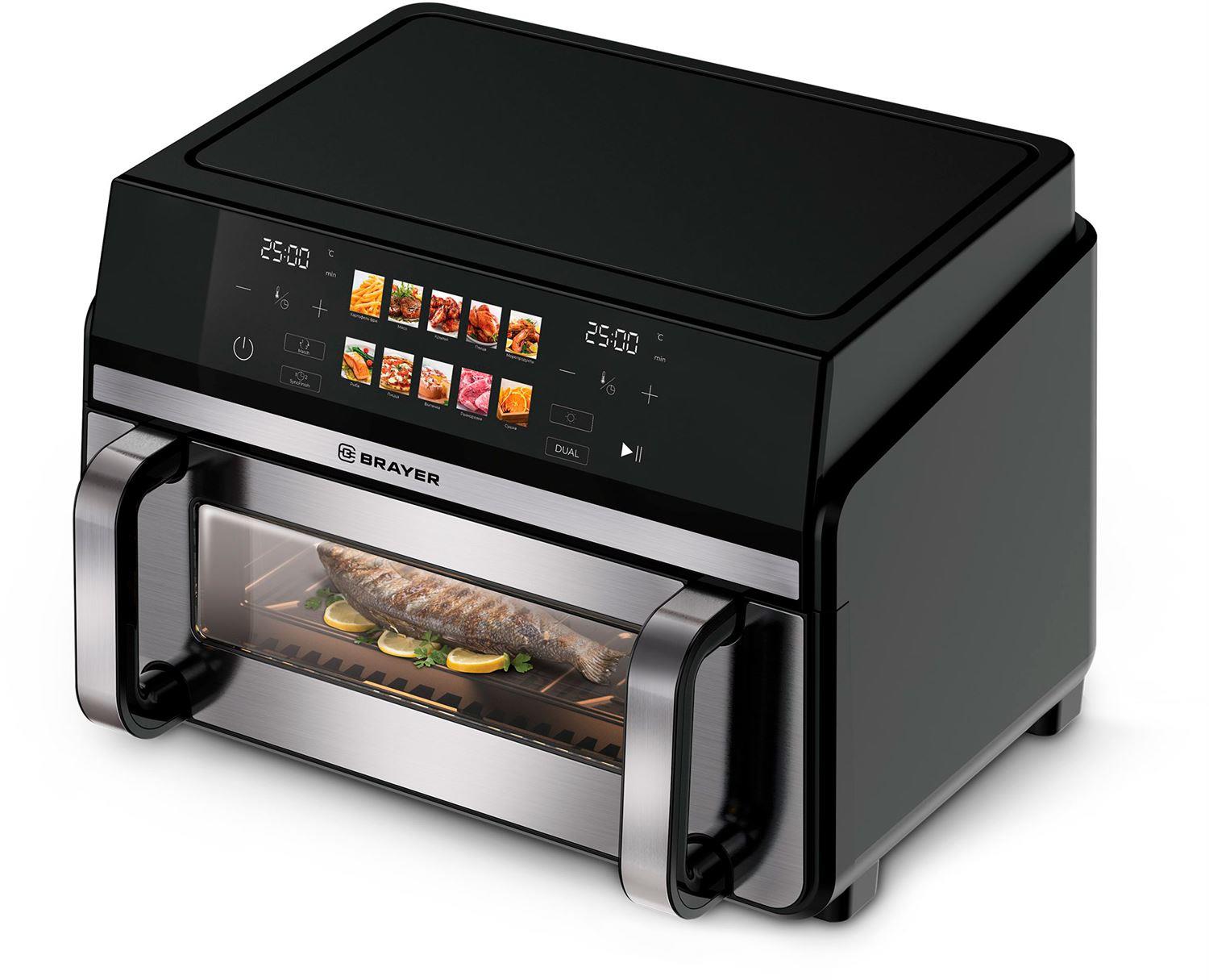 Мощность 2200 Вт Объем 11 л Индивидуальная настройка программ для каждого нагревателя 10 программ: фри, мясо, крылья, курица, морепродукты, рыба, пицца, кекс, разморозка, сушка Функции: «SyncFinish» - синхронизация времени окончания приготовления в обеих чашах «Match» - копирование параметров приготовления на вторую чашу «Dual» - первая и вторая чаша работают независимо друг от друга Корпус из высокопрочного термостойкого пластика Сенсорное управление LED-дисплей Регулировка температуры 30–200 °С Таймер до 60 мин Съемные решетки с антипригарным покрытием Чашу не рекомендуется мыть в посудомоечной машине Звуковой сигнал готовности блюда Электропитание 220-240 В, ~ 50-60 Гц
