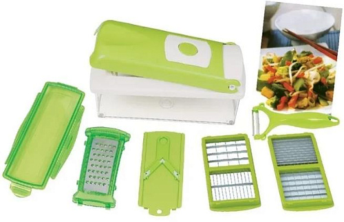 Комплектация овощерезка - 1 шт; книга с рецептами - 1 шт; насадка - 10 шт