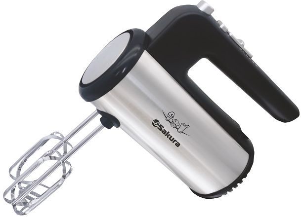 Ручной миксер, мощность 500 Вт, 5 скоростей работы + турбо-скорость, защита от перегрева, корпус и насадки из нержавеющей стали, в комплекте венчики для взбивания и крюки для замешивания теста.
