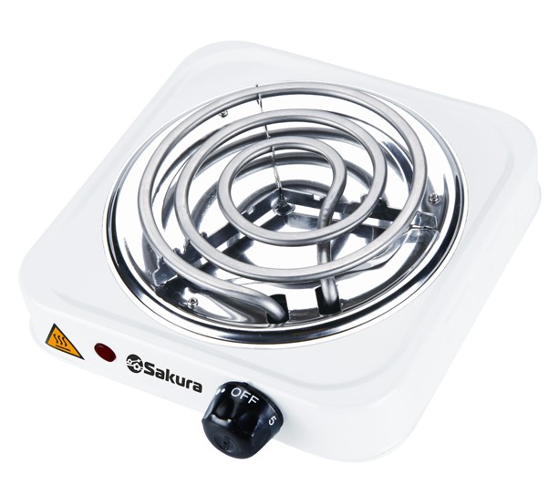 Мощность 1000 Вт, 1 конфорка 145 мм, антипригарное эмалевое покрытие, спиральный нагревательный элемент, регулируемый термостат, индикатор работы, цвет корпуса - белый