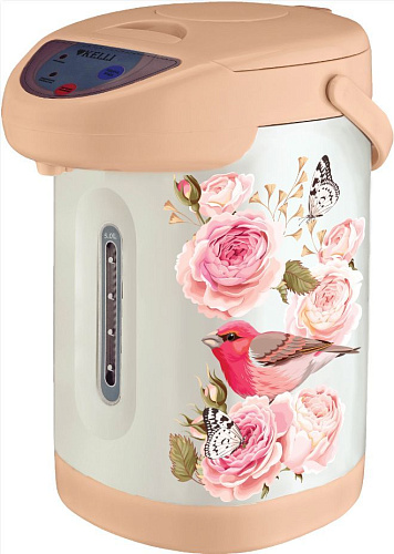 Термопот.Объем: 5л.Мощность: 1100Вт. 3 режима дозировки воды: ручной/ автоматический/ электрический.Пластиковый корпус.Электрическая помпа. Внутренняя емкость из нержавеющей стали. Поворот корпуса на 360°. Световые индикаторы.Шкала уровня воды.Съемная крышка. Съемный сетевой шнур режим поддержания температуры воды. Двойная защита от перегрева. Мощность в режиме поддержания температуры: 35Вт. Сеть: 220-240В, 50гц