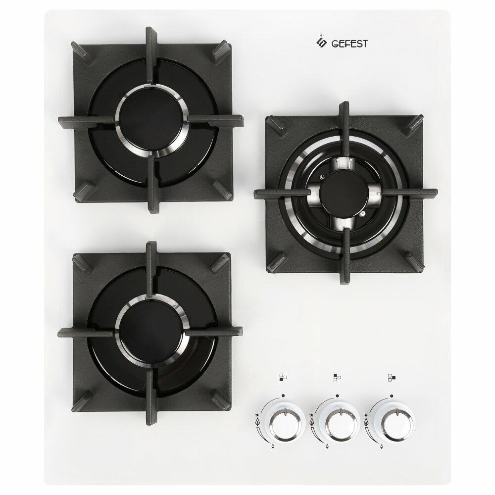 Габаритные размеры ШхГхВ: 45х52.5х10 см. Цвет: белый. Варочная поверхность: стеклянная, "Газ-контроль" горелок стола. Три горелки: одна горелка - двухзонная, две горелки - средней мощности. Встроенный электророзжиг в ручки, фиксированное положение "малое пламя". Чугунные решетки.