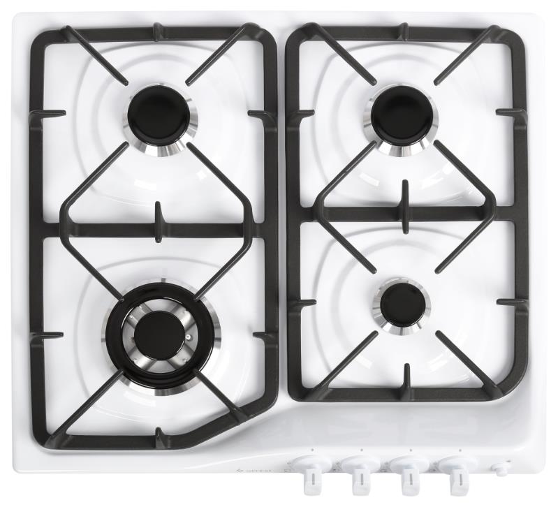 Габаритные размеры ШхГхВ: 59х52х8.5 см * Цвет: белый. Варочная поверхность: эмалированная * Газ-контроль горелок стола * Чугунные решетки горелок стола * Фиксированное положение «малое пламя» * Электророзжиг горелок, кнопка розжига на панели *