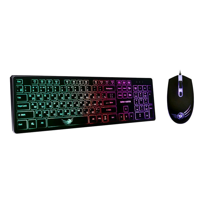 Игровой набор (клавиатура+мышь) мультимедийный, проводной, интерфейс USB, клавиатура - количество клавиш - 104, клавиши Windows, мультимедиа клавиши совмещённые с F-клавишами (активируются клавишей Fn), изменяемый угол наклона, длина кабеля - 1,5м; мышь: оптическая, количество кнопок - 4, колесо прокрутки, изменяемое разрешение - 1600/400/800/1200 dpi, максимальное разрешение мыши в CPI - 1600, длина кабеля - 1,5 м.