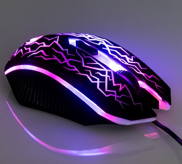 Игровая оптическая проводная мышь с подсветкой. Крупная симметричная мышь - подходит одинаково и для правшей, и для левшей. Подсветка красная, зеленая, синяя, фиолетовя, голубая - сменяется циклически. Матовый черный пластик, верхняя панель с кнопками - пластик софт-тач. Вставки из полупрозрачного светлого пластика (подсветка). Динамически изменяемое разрешение циклически центральной кнопкой (800/1200/1600 dpi). Количество кнопок - 4. Длина шнура - 1,5 м. Размер - 125*70*33 мм. Вес - 71 г.