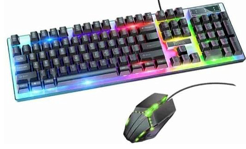 Набор игровой (клавиатура+мышь) проводной; клавиатура - интерфейс USB, количество клавиш - 104, Подсветка символов и клавиш, Регулятор громкости звука, Anti-Ghosting; мышь - оптическая, количество кнопок - 4 , колесо прокрутки, изменяемое разрешение - 800-1000-1200dpi, светодиодная мерцающая подсветка, длина кабеля - 1,45 м.