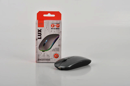 МОДЕЛЬ: LUX (БЕСПРОВОДНАЯ) • Два режима подключения (радиочастота 2,4 ГГц или Bluetooth) • Усовершенствованная беспроводная технология (радиус работы до 10 м) • Высокоточный сенсор с переключаемым разрешением: 800/1200/1600 DPI • Четыре кнопки с колесом прокрутки • Бесшумные кнопки • Прорезиненное колесо прокрутки • PlugnPlay, не требуется установка ПО • Симметричная форма мыши подходит для правой и левой руки • Внутренняя контурная RGB подсветка • Мини-ресивер USB (в комплекте) • Зарядка через кабель Type-C (в комплекте) • Выключатель питания мыши • Системные требования: Windows 10/8/7/XP, Mac OS, свободный порт USB • Размеры: 112 ? 57,2 ? 25,9 мм