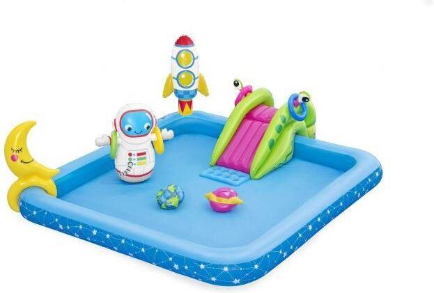 Избавьтесь от летней жары с помощью своего собственного игрового бассейна. Игровой бассейн Bestway® Little Astronaut Play Center отправит вашего ребенка в причудливое путешествие по дальнему космосу. Спуститесь по горке в форме таращащегося инопланетного существа в бассейн. Пройдите мимо ракетного корабля и испытайте охлаждающий эффект встроенного распылителя воды. Этот мягкий распылитель не только даст успокаивающее облегчение от жары, но также может вызвать бурное ерзание и хихиканье. Просто подсоедините садовый шланг, чтобы начать веселые игры! Плещитесь в бассейне и наслаждайтесь игрой «Кольцеброс» с полумесяцем или попробуйте свалить плавающую неваляшку «Космонавт». Полумесяц является съемным и может быть размещен для игры в любом месте на бассейне. Для большего удовольствия в комплект входят надувные фрисби в форме планет, которые можно весело бросать в воздух или плавать с ними в воде. Пусть воображение вашего ребенка разыграется на фоне чудес игрового бассейна Little Astronaut Play Center.