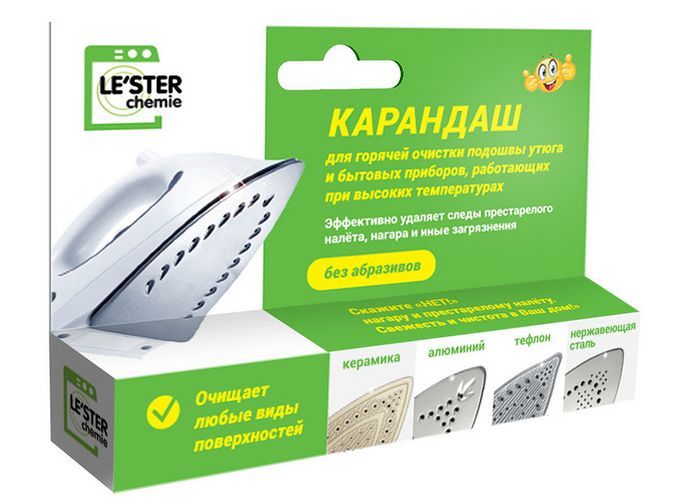 LESTER CH-i1 карандаш для очистки подошвы утюга Карандаш для горячей очистки подошвы утюга и бытовых приборов, работающих при высоких температурах. Применяется для удаления престарелого налёта, нагара и тёмных пятен на подошве утюга, с любого покрытия, а именно керамики, тефлона, нержавеющей стали, алюминия. Упаковка пригодна для многократного использования. Средство безопасно для здоровья человека, может применяться без последующей очистки. Способ применения: Нагрейте утюг до 130-140 (настройте положение терморегулятора утюга на режим "шерсть" или "две точки"). Нанесите равномерными движениями плавящийся карандаш на нагретую поверхность. Снимите слой смеси с подошвы вместе с налётом и нагаром льняной или х/б тканью. Для очистки поверхности в паровом утюге выпустить струю пара. После использования уберите карандаш обратно в упаковку до следующего применения.