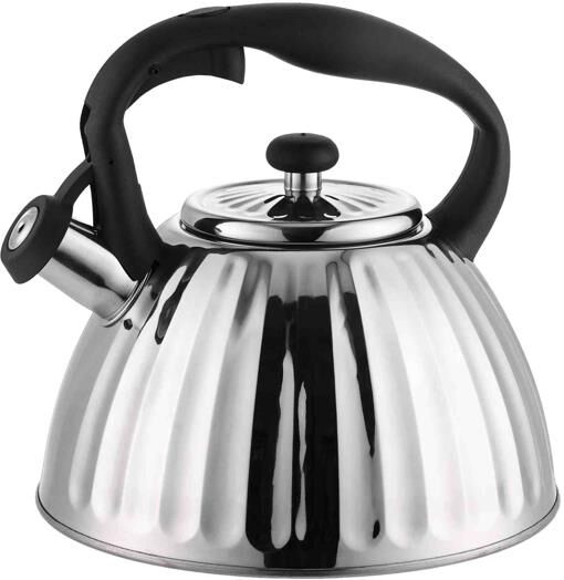 Металлический чайник на газ; Объем: 2 л; Высококачественная нержавеющая сталь; Свистит при закипании; Носик с крышкой; Эргономичная ручка не нагревается; Многослойное капсульное дно; Подходит для всех видов плит