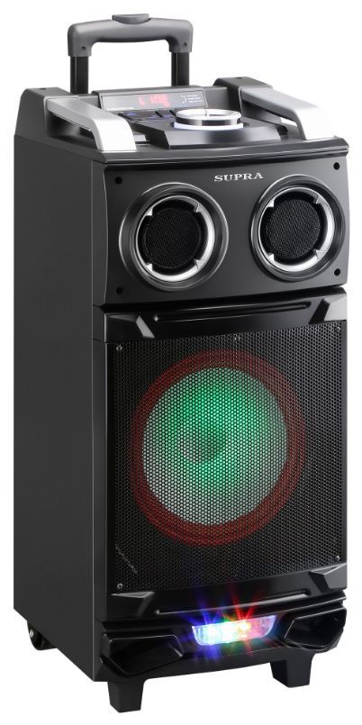 Воспроизведение музыкальных файлов в формате MP3/WMA/FLAC/WAV/APE/AAC. Bluetooth. Поддержка A2DP. FM тюнер. Полнофункциональный пульт дистанционного управления. 3-х цветная светодиодная подсветка. Функция караоке. 1 вход для подключения микрофона. Вход для подключения гитары. Регулировка низких и высоких частот, а также эхо-эффекта канала микрофона. USB разъем. SD разъем. Двухканальный линейный вход. Максимальная мощность: 850 Вт. Акустическая система RMS: 140 Вт. Питание: ~100 – 240 В, 50-60 Гц. Встроенный аккумулятор: 4,5 Ач.