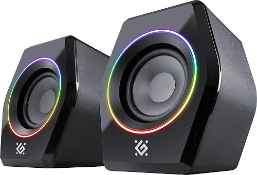 Геймерские компьютерные колонки со светодиодной подсветкой и с функцией Bluetooth 5.3. Для удобства пользователя панель управления вынесена на проводной пульт, в котором расположились регулятор громкости, разъемы для подключения гарнитуры, кнопка управления режимами подсветки (9 режимов), переключения режимов AUX/Bluetooth и включения/ выключения питания.