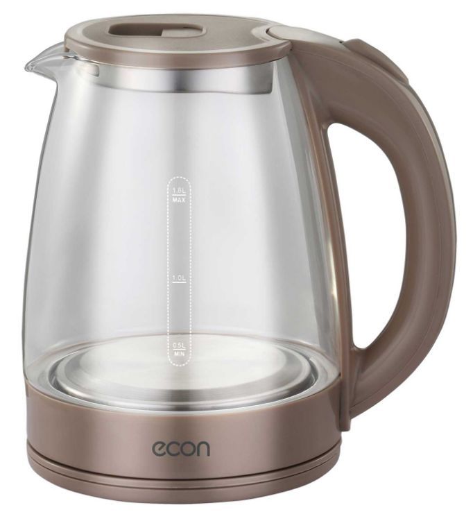 ECON ECO-1847KE Объем 1.8 л Потребляемая мощность 1500 Вт Нагревательный элемент скрытый Покрытие нагревательного элемента нержавеющая сталь Индикатор уровня воды Форма корпуса коническая Материал стекло