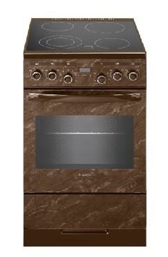 Цвет: коричневый с рисунком "мрамор". Варочная поверхность: стеклокерамическая. * Габаритные размеры ШхГхВ: 50х58.5х85 см * Объём духовки: 55 л * Вертел с электроприводом * Объемный нагрев с конвекцией * Выдвижной ящик для посуды и принадлежностей * Подсветка духовки одинарная * Гриль * Съемные проволочные направляющие духовки * Двухзонная конфорка * Таймер сенсорный многофункциональный * Ножки регулировочные * Ускоренный нагрев с конвекцией