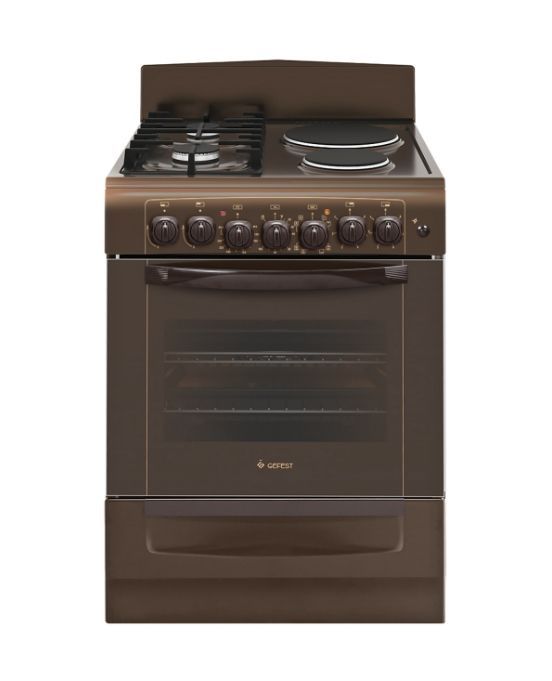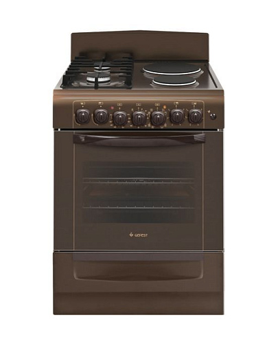Газоэлектрическая плита. Габаритные размеры ШхГхВ: 60х60х85 см. Объём духовки: 55 л. Цвет: коричневый. Варочная поверхность: эмалированная. Крышка: щиток. Выдвижной ящик для посуды и принадлежностей. Терморегулятор (термостат). Гриль электрический. Усиленный гриль с конвекцией. Ножки регулировочные. Ускоренный нагрев с конвекцией. Объемный нагрев с конвекцией. Чугунные решетки горелок стола. Подсветка духовки двойная. Шашлычница. Съемные проволочные направляющие духовки. Электророзжиг горелок, кнопка розжига на панели. Таймер электромеханический.