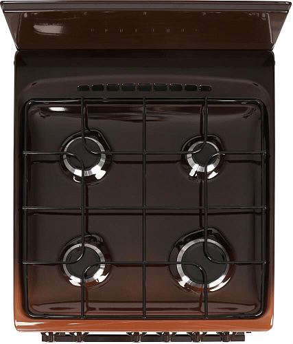 Габаритные размеры ШхГхВ: 50х58,5х85 см * Цвет: коричневый. Варочная поверхность: эмалированная * Объём духовки: 60 л. Духовка: электрическая * Подсветка духовки одинарная * Штампованные направляющие духовки * Терморегулятор (термостат) * Электророзжиг горелок, кнопка розжига на панели *