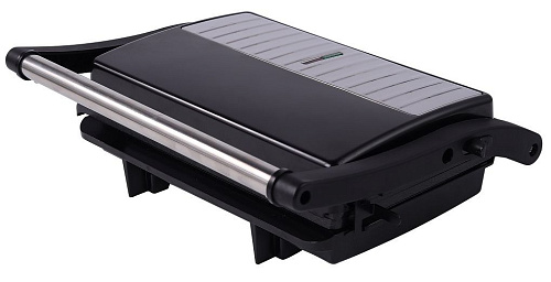 Гриль электрический, мощность 1000Вт, 2 рифленые панели для жарки, размер панели 23.1х14.6 см, антипригарное покрытие, открытие панелей на 180° (возможность приготовления на 2 пластинах одновременно), индикатор работы, прорезиненные ножки. Корпус из нержавеющей стали и термостойкого пластика.