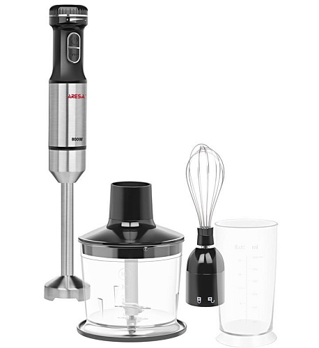 ARESA AR-1124 КОМПЛЕКТАЦИЯ: Мерный стакан для смешивания (объём 0,6 л) с крышкой Чаша для измельчения (объём 0,5 л) Венчик для взбивания Нож для измельчения Характеристики Мощность: 800 Вт Плавная регулировка скорости Функция«ТУРБО» (максимальное увеличение скорости) Ножка блендера из нержавеющей стали Съемная насадка-блендер с 4-х лопастным ножом Эргономичный дизайн 3 ОСНОВНЫЕ ФУНКЦИИ: Измельчение Смешивание Взбивание