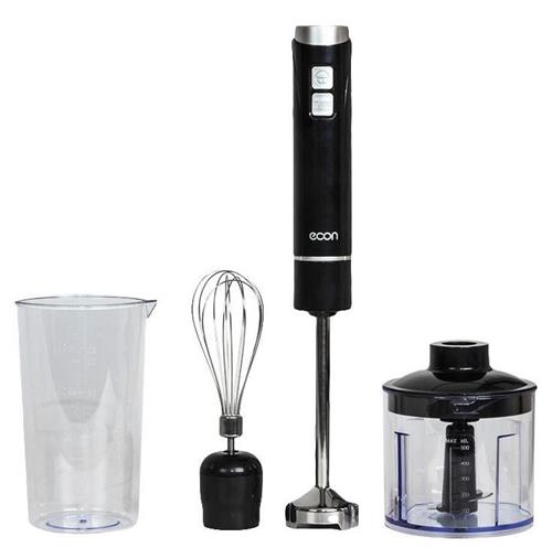 Блендер погружной, максимальная мощность 800 Вт, компактый размер - диаметр корпуса 42 мм, 2 скорости, насадка-блендер из нержавеющей стали, съемная насадка-венчик из нержавеющей стали, мини-измельчитель 500 мл, мерный стакан 700 мл, цвет черный с серым