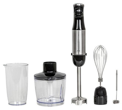 Блендер погружной, набор, максимальная мощность 1200 ватт, бесступенчатая регулировка скорости в одно касание, светодиодная подсветка, измельчитель 500 мл, мерный стакан 600 мл, венчик для взбивания, венчик для вспенивания молока, петля для подвешивания, длина кабеля 1,15 м.