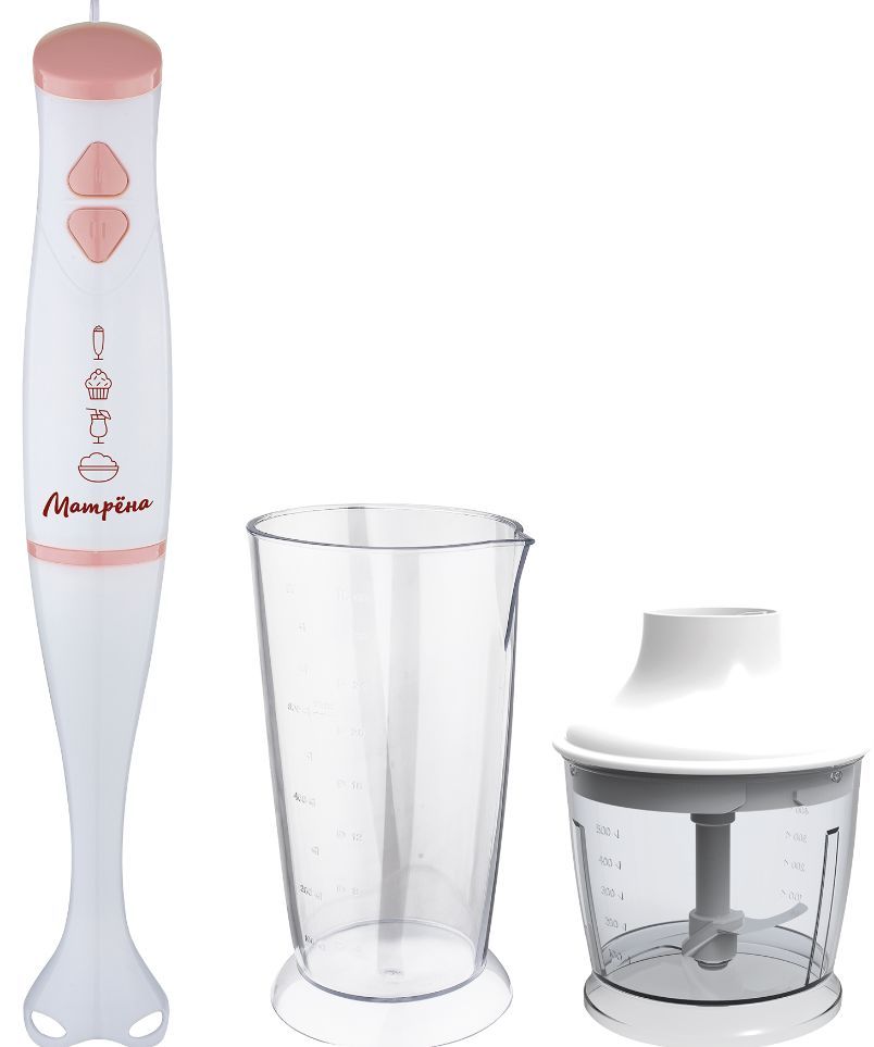 2 скорости работы. Ножи из нержавеющей стали. Пластиковая насадка блендер. Мощность 350Вт. Измельчитель 500 мл. Стакан для смешивания 800 мл.