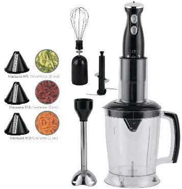 Погружной блендер, мощность 950W, современный эргономичный дизайн, пульсовый режим работы, 2 скорости, 4 лезвия из нержавеющей стали, металлическая нога блендера, венчик для взбивания, чаша с ножом для рубки и измельчения, 1250 мл; три насадки-спиралайзера для нарезки: тальятелли (10 мм), лингвини (5 мм) , спагетти (3 мм), автоматическая блокировка при неправильно установленной насадке, удобство и простота в обращении и чистке