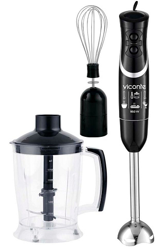Погружной блендер, мощность 950W, пульсовый режим работы, 2 скорости, металлическая нога блендера, венчик для взбивания, чаша объемом 1250 мл с ножом из 4 лезвий для рубки и измельчения, автоматическая блокировка при неправильно установленной насадке.