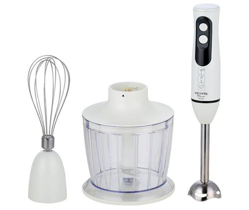 Погружной блендер Viconte VC-4441 800 W, Погружной блендер, мощность 800W, современный эргономичный дизайн, пульсовый режим работы, 2 скорости, лезвия из нержавеющей стали, металлическая нога блендера, венчик для взбивания, чаша с ножом для рубки и измельчения, 600 мл; автоматическая блокировка при неправильно установленной насадке, удобство и простота в обращении и чистке.