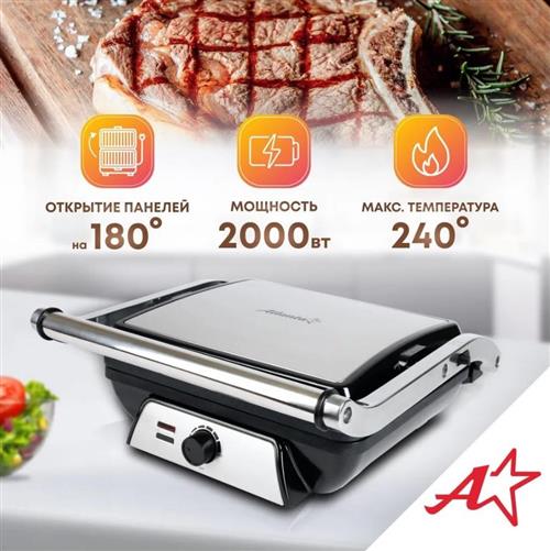 Гриль электрический, мощность 2000 Вт, регулируемый термостат (максимальная температура 240°С), 2 рифленые панели для жарки, размер панели 29,7х23,6 см, антипригарное покрытие, открытие панелей на 180° (возможность приготовления на 2 пластинах одновременно), индикатор работы, прорезиненные ножки. Корпус из нержавеющей стали и термостойкого пластика. Комплектация: резервуар для сбора масла. Длина шнура 65 см