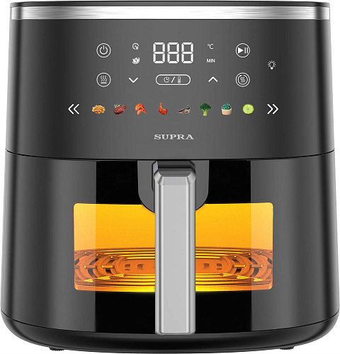 Аэрогриль, электронное управление, цветной светодиодный дисплей, мощность: 2000 Вт, внутренний объем: 7 Л, антипригарное покрытие , смотровое окно , внутренняя подсветка, таймер, регулируемая температура: 60-220 градусов, ручная настройка режимов приготовления, 8 предустановленных программ приготовления