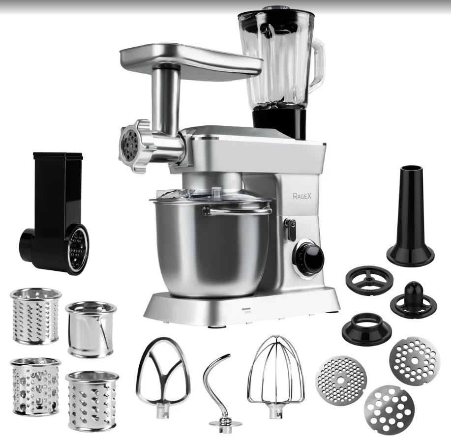 Мощный кухонный комбайн R112-900 с серебристым корпусом и 1300 Вт мощности предлагает профессиональные возможности для кулинарии. Устройство оснащено просторной 4.5-литровой чашей из нержавеющей стали и 1.5-литровым стеклянным блендером, сочетая три основные функции: мясорубку, блендер и планетарный миксер. 10-скоростной режим работы (от 5500 до 17000 об/мин) с импульсным вариантом обеспечивает точный контроль процесса приготовления. Прочные материалы: пластиковый корпус, стальные режущие элементы, алюминиевые насадки миксера и стеклянная чаша блендера гарантируют долговечность. Практичные особенности включают две удобные ручки на чаше, нескользящие ножки, импульсный режим, простую смену насадок и место для хранения кабеля. В комплекте: металлическая чаша, защитная крышка, крюк для теста, венчики для взбивания и перемешивания, лопатка, полный набор для мясорубки (с насадками для колбасок и кеббе), овощерезка с различными терками и слайсером, а также подробная инструкция. Упакован в две коробки - транспортировочную и подарочную, что делает его отличным выбором для требовательных пользователей.