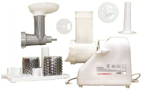 Комплектация: мясорубка, 2 диска для фарша, насадки для терки, шинковки, колбас, соковыжималки, толкатель