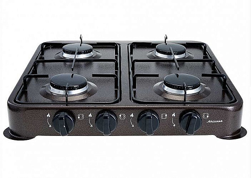 АКСИНЬЯ КС-108 коричневый Номинальная тепловая мощность конфорок 2,2х4 кВт Номинальный расход газа 640 г/ч Номинальное давление газа 3000 Па Вид сжиженного газа G30 (бутан/пропан) Количество конфорок 4 конфорки Тип настольная Тип розжига горелки ручной Максимальная нагрузка на одну конфорку 10 кг Минимальный/максимальный диаметр дна посуды 120/160 мм Предназначена для приготовления и разогрева пищи в бытовых условиях, только с бытовыми газовыми баллонами Покрытие рабочей поверхности из термостойкой эмали Цвет эмали: коричневый Поворотные механические регуляторы пламени конфорок Возможность присоединения газового шланга с двух сторон Плита отрегулирована для работы на сжиженном газе, использовать только с бытовыми газовыми баллонами (объемом 5 л; 12 л; 27 л или 50 л) Подсоединение газовой плиты к газовому баллону должно осуществляться при помощи регулятора давления газа (редуктора), резинового шланга и хомута