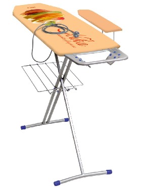 Гладильная поверхность -фанера (1225х345мм), два положения высоты h-70см, h-85см, EUROподставка под утюг с термосиликоном, съемный подрукавник, электросоединитель 2,2м, розетка, полка для белья, материал чехла-хлопок, max нагрузка на глад.поверхность 15