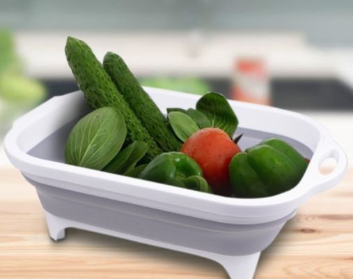 Складная корзина 4 в 1/ Разделочная доска Складная корзина совмещает в себе несколько предметов! Это легкая и емкая корзина для хранения продуктов, а так же органайзер для кухни. Ее можно использовать как дуршлаг, благодаря съемному сливу-нет необходимости поднимать и переворачивать тяжелую емкость. Удобные ручки помогут легко положить и вынуть корзину из раковины. Наличие противоскользящих ножек делает ее прочной и устойчивой. А в сложенном виде-это прочная и удобная доска для нарезки с ручками и желобами для слива соков. Кроме того, ее просто и компактно хранить, она портативна, поэтому идеальна для использования вне дома и на открытом воздухе. Изготовлена из пищевого пластика премиум-класса PP+TPR материала, без бисфенола, очень прочная, стойкая к запахам и устойчива к пятнам. Силикон высокого качества, что обеспечивает долгий срок службы и удобство в применении. Внимание! Изделие прочное и плотная резина складывается при усилии, необходима аккуратность.