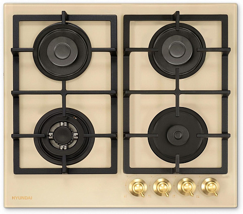 Газовая варочная поверхность, ширина 60 см, 4 газовые конфорки, поворотные переключатели, электроподжиг, чугунные решетки, цвет - бежевый