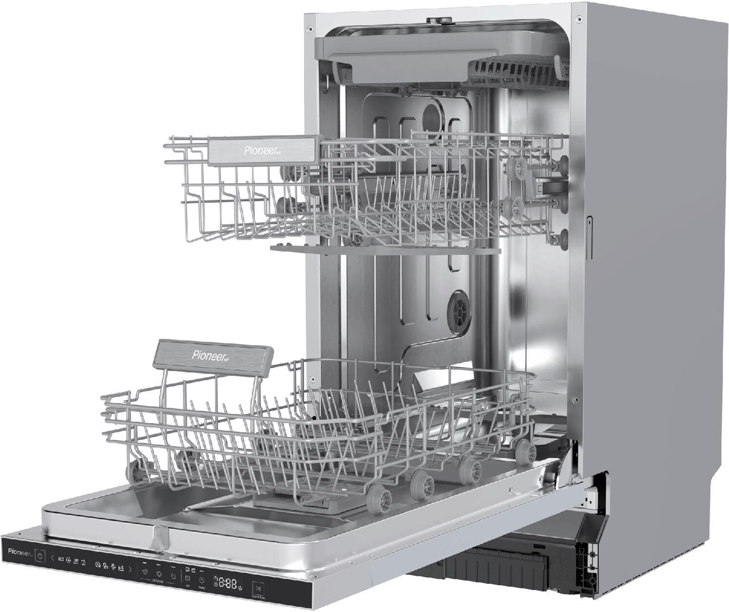 Встраиваемая посудомоечная машина 45 см; Класс энергоэффективности А+++; 10 комплектов; 8 программ: ЭКО, Авто, Гигиеническая мойка, Шепот, 90 мин, Быстрая мойка 35 мин, Предварительная мойка 14 мин, Самоочистка; 3 корзины; Сенсорное управление; LED индикатор (цвет белый); Таймер отсрочки 1-24 ч; Аквастоп; Луч на полу (точка), цвет синий; Автооткрытие дверцы; Двухзонная мойка; Дополнительная сушка\Сушка с подогревом; Напряжение 220-240 В; Частота 50 Гц; Номинальная мощность 1760~2100 Вт; Давление воды на входе 0,04~1,0 МПа; Мощность нагревательного элемента 1800 Вт; Шум 47 дБ(А); Самоочищающаяся система фильтров; Длина шнура питания 1500 мм; Длина впускного шланга 1500 мм; Длина выпускного шланга 1614 мм; Размер 448*550*815 мм; Вес нетто 37,0 кг