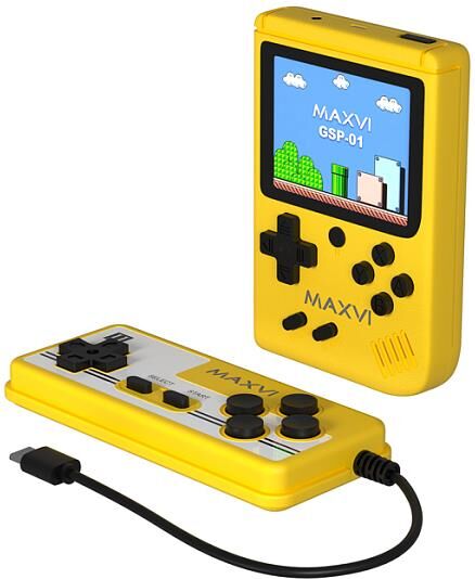 Maxvi GSP-01 – портативная игровая консоль с 500 встроенными играми. Игровая консоль позволяет выводить изображение на телевизор посредством AV кабеля (в комплекте). Питание приставки осуществляется от аккумулятора 600 mAh, который позволит Вам наслаждаться играми до 3-х часов без перерыва. Для второго игрока предусмотрен джойстик, который идёт в комплекте.