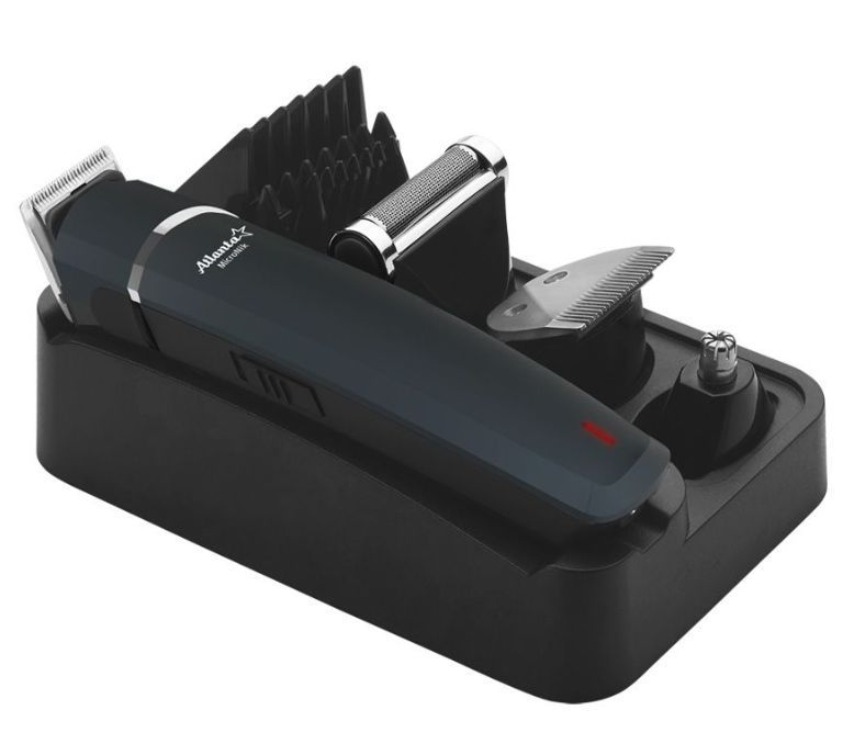 Разъем для зарядки Micro USB. Питание от аккумулятора и от кабеля. Зарядный кабель в комплекте. Подставка для всего набора. Полноразмерный триммер для стрижки. Две насадки для стрижки волос. Сверхточный триммер с насадкой для бороды. Гигиенический триммер. Насадка бритва. Все насадки можно промывать в воде. Индикатор зарядки. Долговечная Lo-ion батарея 2,4 В 500 мА/ч.