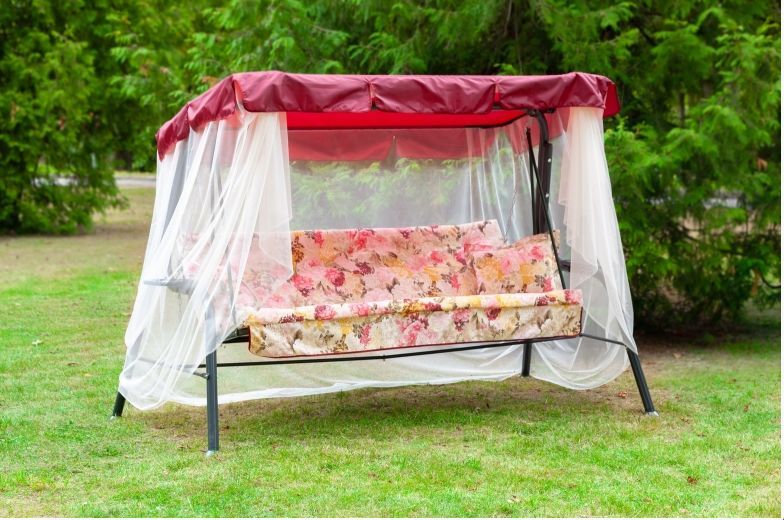 Дополнительная информация мягкий элемент: ткань 45% п/э – 55% хлопок, плотность 108-111г/м2, наполнитель мягкого элемента (аэрофом 50мм +синтепон), наполнитель подушек (крошка поролона); основание спанбелл, декор тафтинг; подушки – 2шт; тент с сеткой противомоскитной: ткань с водоотталкивающей отделкой 100% п/э плотность 80г/м2; противомоскитная сетка пришита к тенту; регулировка спинки: осуществляется звеньями цепи на требуемый угол наклона