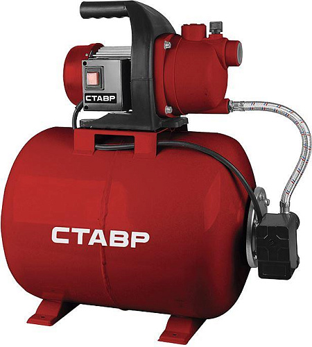 Ставр НС-1200/50 Насосная станция, 50л, 1200 Вт, производительность 63,3 л/мин, высота подъема 40м, давление 1,4-2,4 бар, глубина всасывания 8м, выходной патрубок 1", корпус - пластик, размер частиц 1мм, защита от перегрева, сетевой кабель 1,5м