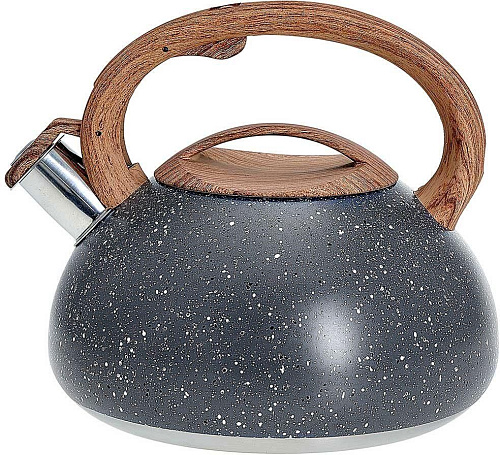 Объем 3 л Толщина стали 0,6 мм Чайник из нержавеющей стали со свистком Высококачественная нержавеющая сталь c цветным покрытием Цвет: серый гранит Термосберегающее индукционное дно Нейлоновая ручка с противоскользящим покрытием и с кнопкой открывания носика Цвет ручки и крышки: светлое дерево Пригоден для использования на всех типах кухонных плит, включая индукционные Упаковка: цветная коробка