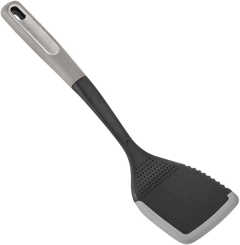 Лопатка CHEF из нейлона с силиконовым краем Материал: нейлон, силикон, полипорпилен (ручка). Силиконовый край - защита посуды от царапин. Картонная подложка+пакет. Размер: 34*8,8*4,1 см. *Край модели рифленый - предназначен для нарезки приготовленного мяса/стейков; рабочая часть дополнена тёркой для чеснока/имбиря, прочего.